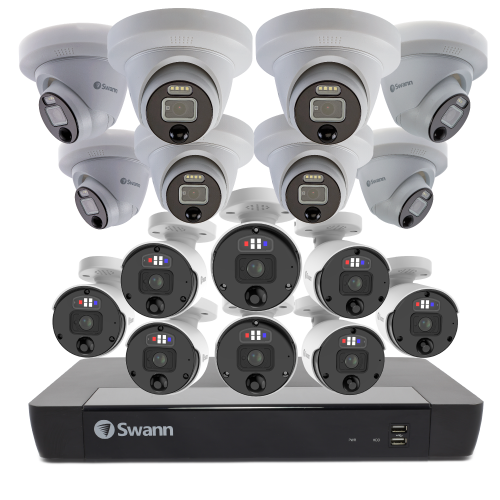 Ensure comprehensive security with Swann’s 16 Camera 16 Channel 4K Ultra HD Professional NVR Security System. This system offers exceptional 4K resolution, True Detect™ heat and motion-sensing technology, Night2Day™ color night vision, and two-way audio. With a massive 3TB HDD, it provides extensive storage. Equipped with spotlight cameras, siren, and sensor warning lights, it enhances deterrence. Manage and access footage remotely via the Swann Security App.
